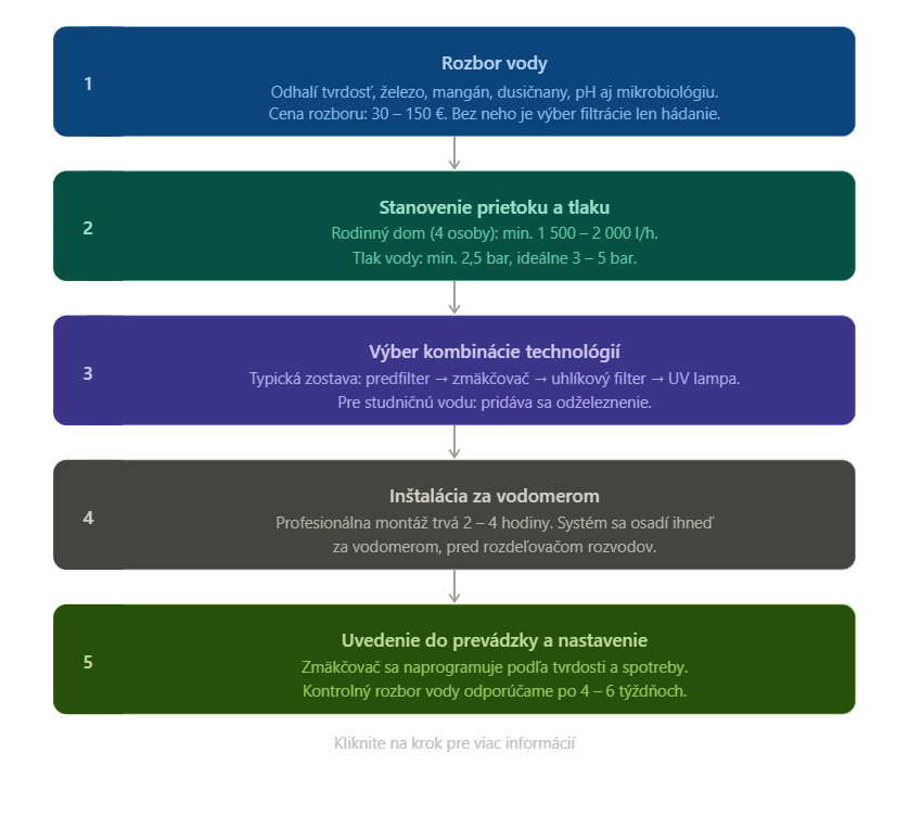 Výber konkrétnej technológie závisí od výsledkov rozboru vody. Práve preto odporúčame začať vždy rozborom – bez neho je akýkoľvek výber len hádanie. Na hlavnom prívode sa najčastejšie inštalujú nasledujúce zariadenia: