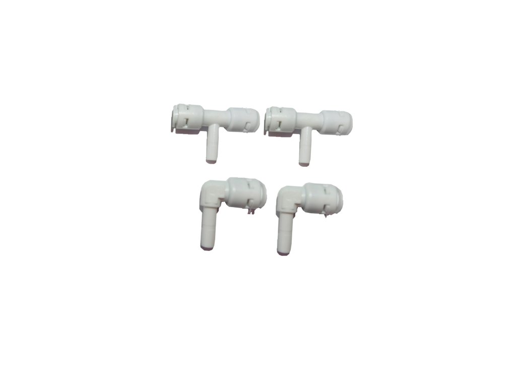 Sada obsahuje 2x Kolienko 90° 1/4"nástrčná uhlová spojka a 2x Spojka v tvare T (1/4", 1/4", nastrkávacia).